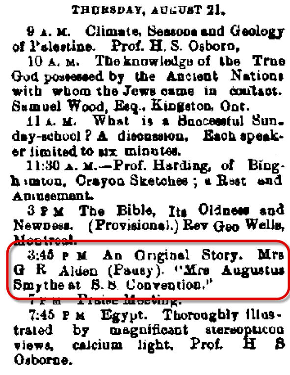 On Friday, September 20, 1878, she appeared at the Gloversville Baptist Church to give a public reading of the story.