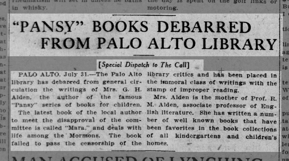 In 1901 Isabella Alden’s books fell under the scrutiny of the Boston Public Library’s reading committee. Here’s an excerpt of an article that ran in the San Francisco Call on March 17, 1901: