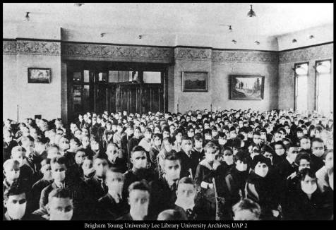 Students at Brigham Young University wear hygienic masks during a lecture in 1918.