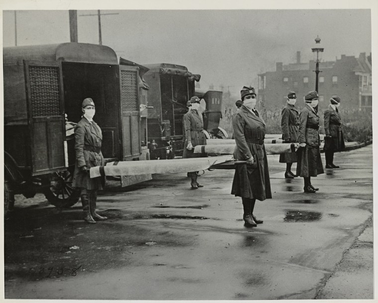Red Cross workers in St. Louis report for duty with their ambulances, October 1918.