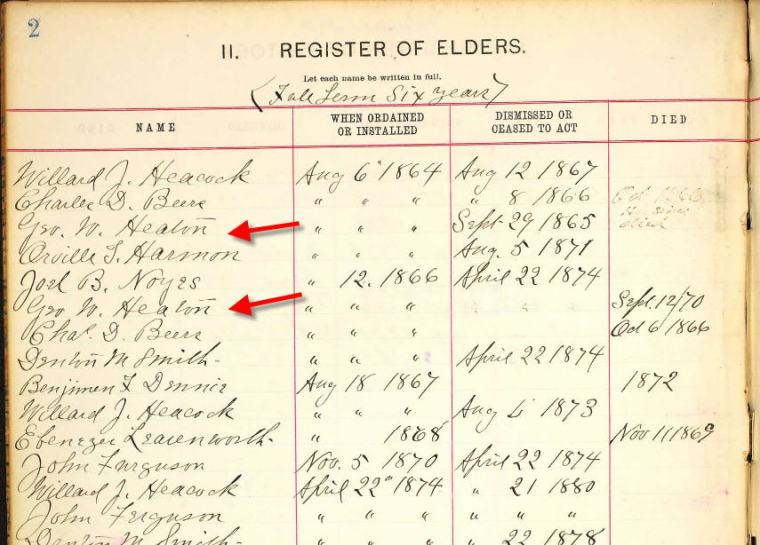 George was a devout Christian, a temperance worker, and active in his church. This record from the First Presbyterian Church in Gloversville, New York shows George was elected as a Church Elder in 1864 and served in that capacity until his death in 1870.