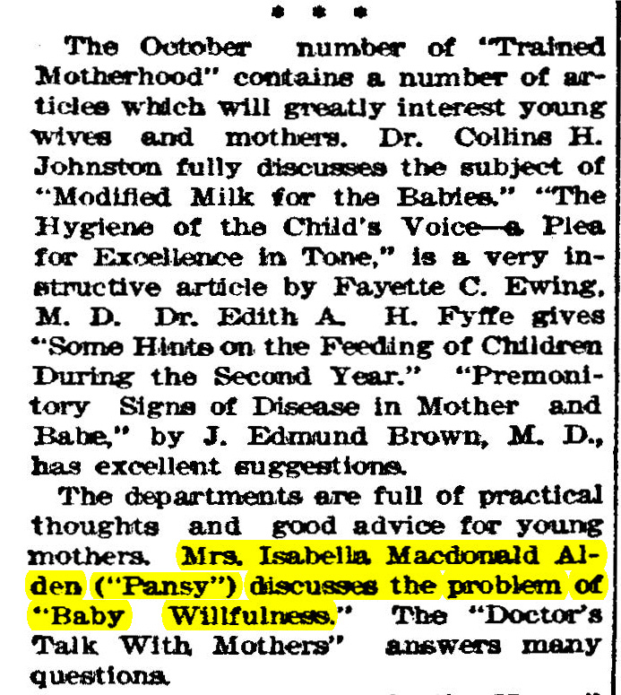 Perhaps Isabella’s speeches and magazine articles on the topic of rearing children offered fresh new perspectives because of her experience with Frances.