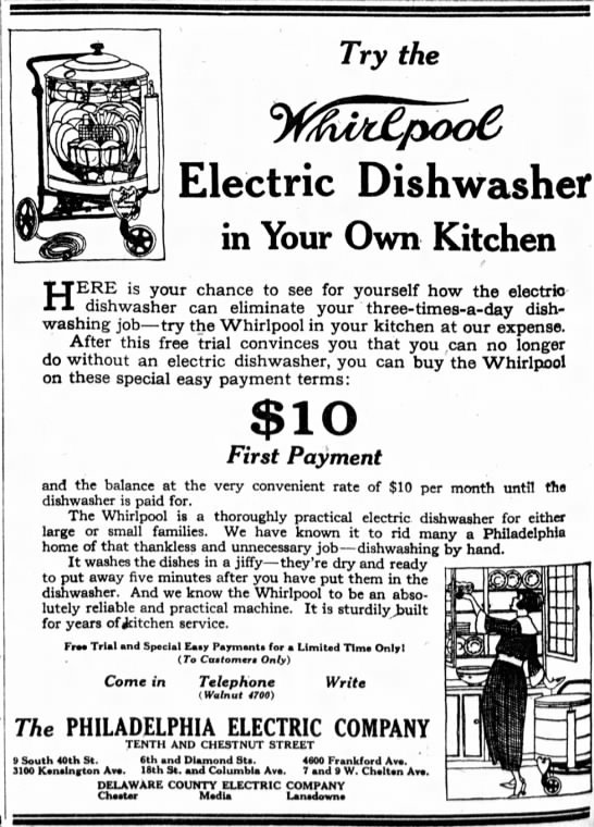 Electric dishwashers were a luxury because of their cost, but by 1920 Whirlpool was actively marketing their dishwasher models in newspapers and magazines across the country.