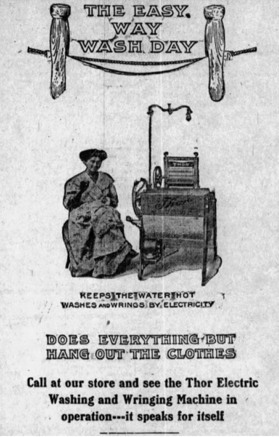 Electric washing machines cut in half the time required to do a family’s laundry, because they took the place of galvanized tubs, washboards and elbow grease.