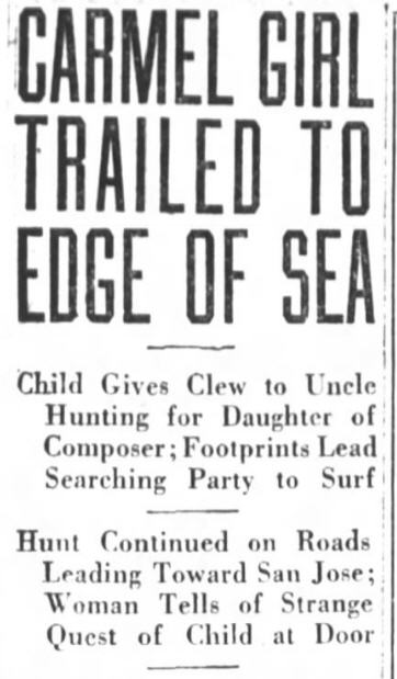 Unbeknownst to Isabella, that same Monday morning a fourteen-year-old girl named Ruth Cator also left her house in Carmel-by-the-Sea. Ruth was the daughter of composer Thomas Cator, and had recently returned home from a stay at a sanitarium where she had been treated for what her parents described as a “nervous breakdown.” When her parents discovered her missing early that Monday morning, they immediately feared Ruth was again “out of her mind” and in danger.