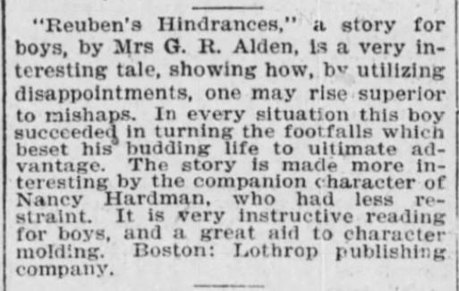 An 1898 announcement for Isabella’s new book, Reuben’s Hindrances (The Boston Globe, December 3, 1898).