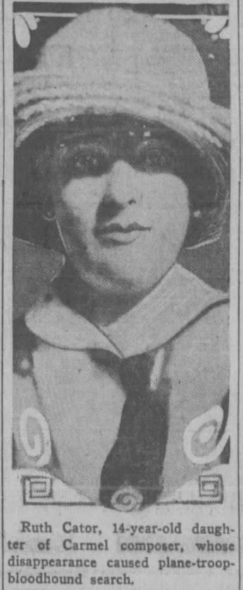 Unbeknownst to Isabella, that same Monday morning a fourteen-year-old girl named Ruth Cator also left her house in Carmel-by-the-Sea. Ruth was the daughter of composer Thomas Cator, and had recently returned home from a stay at a sanitarium where she had been treated for what her parents described as a “nervous breakdown.” When her parents discovered her missing early that Monday morning, they immediately feared Ruth was again “out of her mind” and in danger.