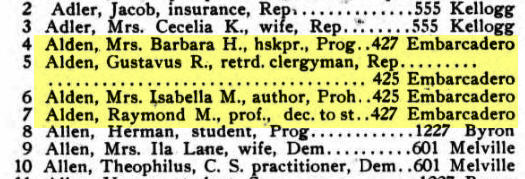 In 1911 when women gained the vote in California, Isabella was a resident of that state. Here’s Isabella’s name (along with the names of her husband, her son Raymond and daughter-in-law Barbara) on the 1916 list of California registered voters. You can see she claims affiliation with the Prohibition Party.