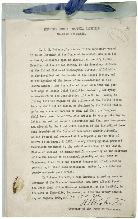 On August 18, 1920 the state of Tennessee ratified the 19th Amendment, ensuring the right to vote could not be denied based on gender. Four days later, with the stroke of Tennessee Governor Albert H. Roberts’ pen, the eighty year struggle was over.