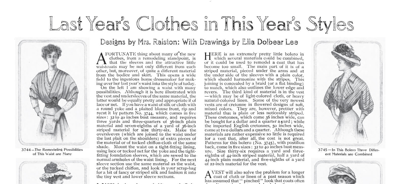 And Esther’s mother—being a skilled needlewoman—could refresh an old skirt by adding a new band of fabric to the hem, in much the same way as The Ladies Home Journal recommended in a 1908 issue: