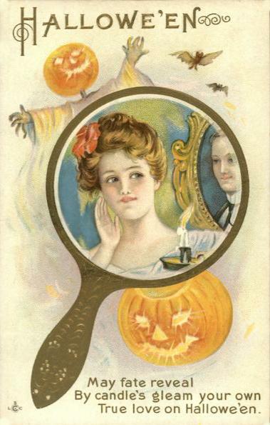 In other games, mirrors and candles served as props. One variation was for women with strong wills; they walked down the cellar steps backward, with a mouthful of salt, a candle in one hand, and a mirror in the other. If she performed the ritual correctly, the young woman should see the image of her future husband over her shoulder in the glass.
