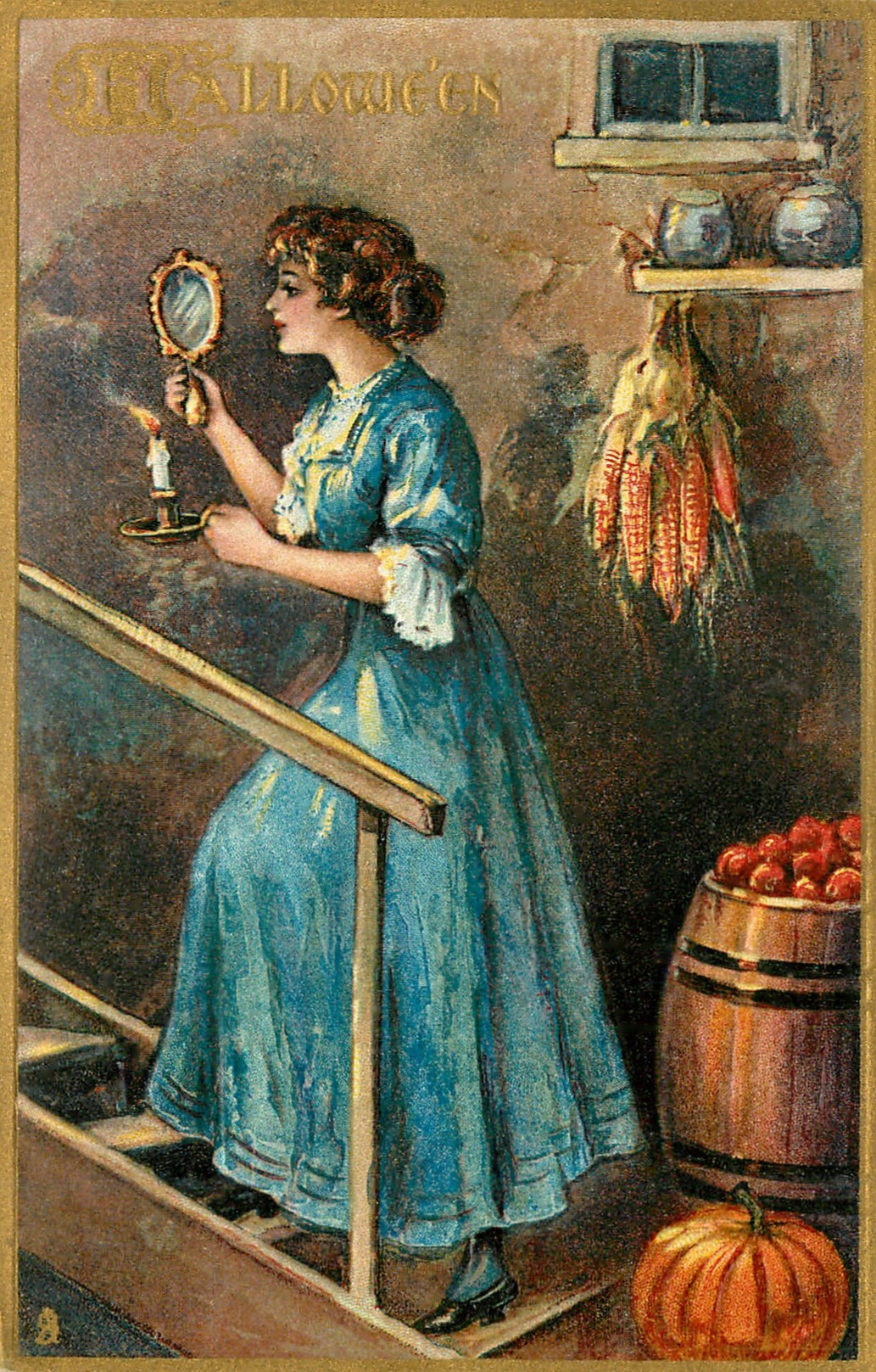 In other games, mirrors and candles served as props. One variation was for women with strong wills; they walked down the cellar steps backward, with a mouthful of salt, a candle in one hand, and a mirror in the other. If she performed the ritual correctly, the young woman should see the image of her future husband over her shoulder in the glass.