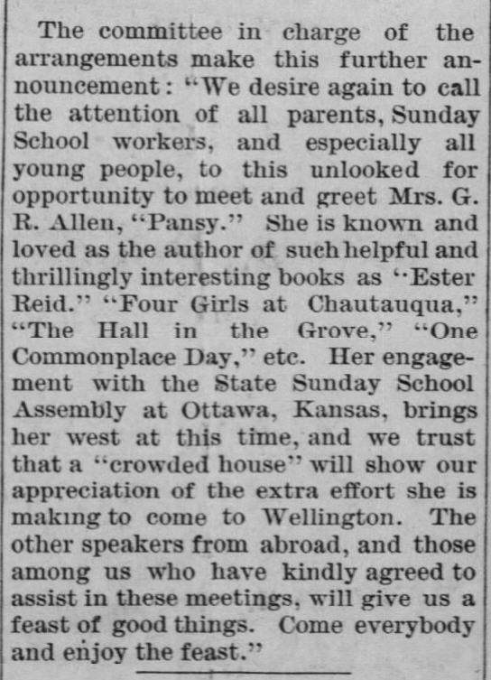 ![Newspaper clipping: The committee in charge of the arrangements make this further announcement: “We desire again to call the attention of all parents, Sunday School workers, and especially all young people, to this unlooked for opportunity to meet and greet Mrs. G. R. Allen [sic], “Pansy.” She is known and loved as the author of such helpful and thrillingly interesting books as “Ester Ried,” “Four Girls at Chautauqua,” “The Hall in the Grove,” “One Commonplace Day,” etc. Her engagement with the State Sunday School Assembly at Ottawa, Kansas, brings her west at this time and we trust that a “crowded house” will show our appreciation of the extra effort she is making to come to Wellington. The other speakers from abroad, and those among us who have kindly agreed to assist in these meetings, will give us a feast of good things. Come everybody and enjoy the feast.](https://isabellaalden.com/wp-content/uploads/2025/06/06-11-05.jpg?w=544)