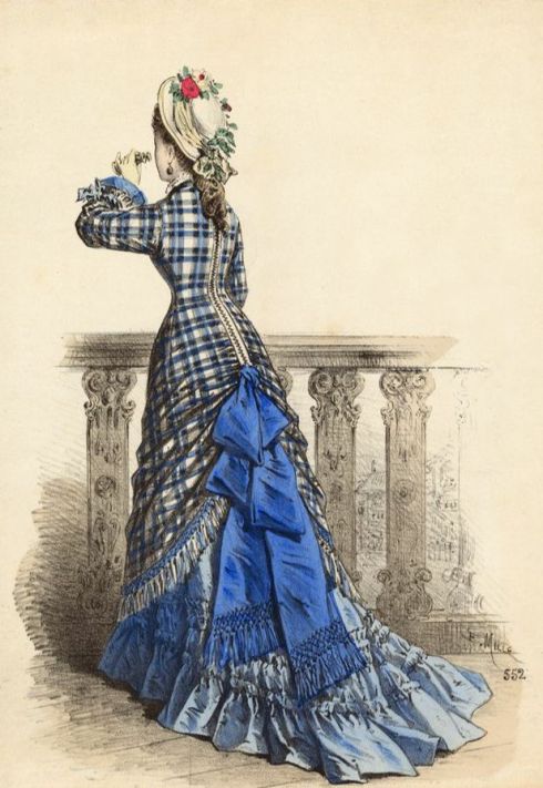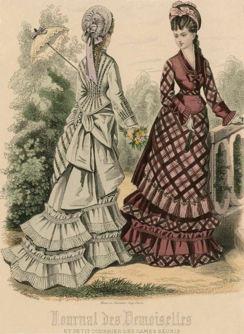Her choice of a plaid fabric for her gown indicates Isabella kept up with current styles, such as the plaid gown in the 1875 fashion plate above, or the plate dated 1877 below: