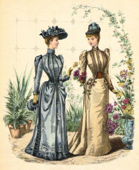 By 1891 women’s fashions began to change dramatically. Skirts took on slimmer silhouettes, and sleeves went the opposite direction—instead of slim and fitted, they were gathered to form puffs at the shoulders before tapering to fitted cuffs like these: