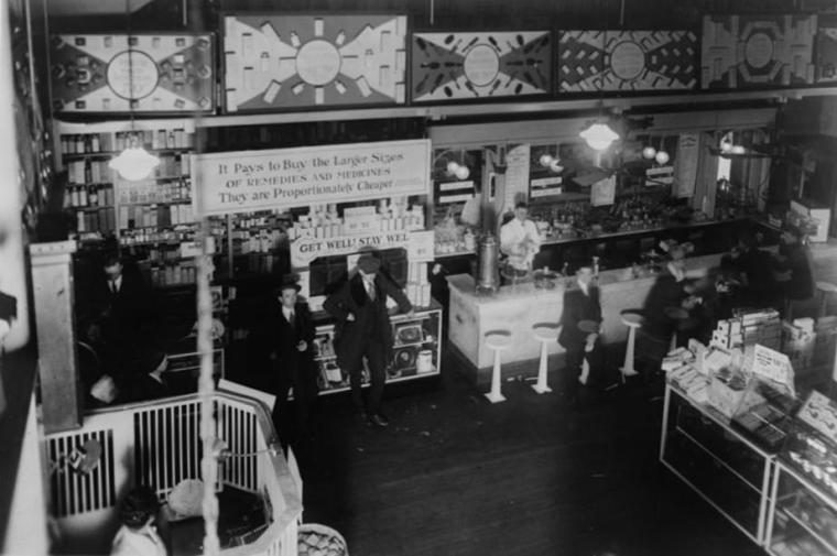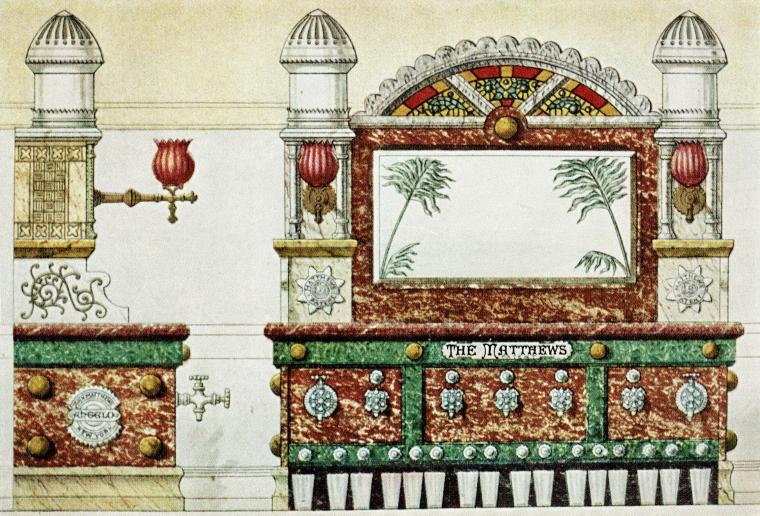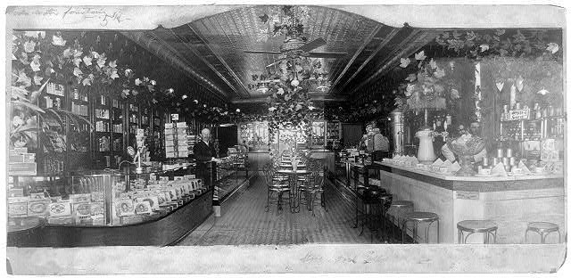 [It was ] glittering with its show of colored glass and brilliant liquids, and arranged with that regard to lovely combinations of color which is common in first-class drug stores. There is at one end a handsome soda fountain, with all the various cooling syrups and elegant appliances of first-class establishments.