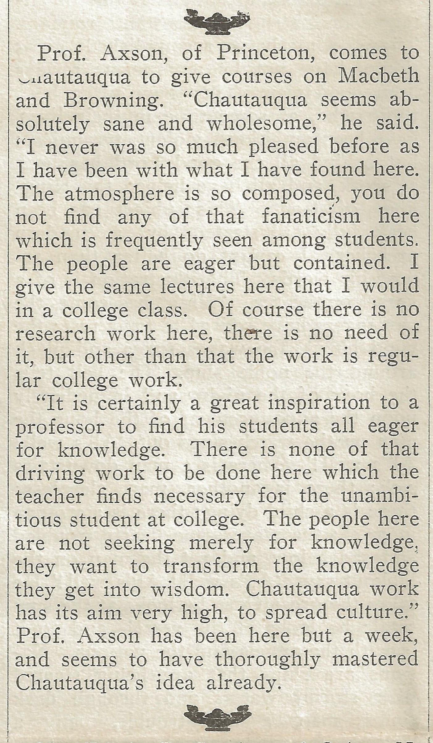 In the summer months the Aldens and the Livingstons traveled to Chautauqua, New York and shared a cottage on the grounds of the Chautauqua Institution.