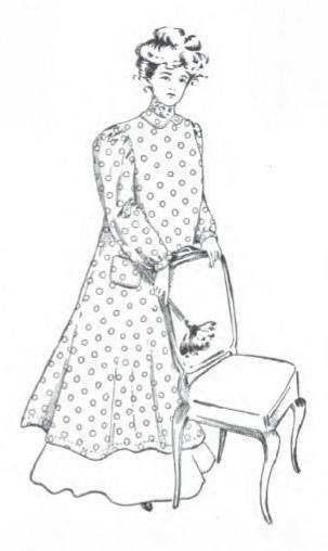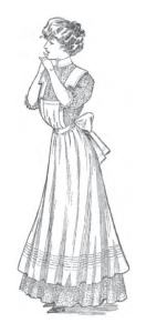 But about her apron . . . I saw it first one morning when I crossed the street to my neighbor’s side door that opens directly into the large living room, and met Muriel in the doorway, as pretty a picture as a fair-haired, bright-eyed girl of seventeen can make. She was in what she called her uniform, a short dress made of dark print, cut lower in the neck than a street dress. It had elbow sleeves, and a bit of white braid stitched on their bands and around the square neck set off the little costume charmingly.