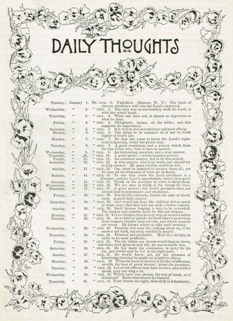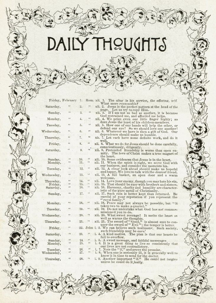 “Daily Thoughts” was printed on the first day of each month, and consisted of a list of Bible verses meant to be read individually, one each day.