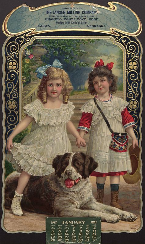 A 1913 calendar trade card, featuring two girls and a Newfoundland.