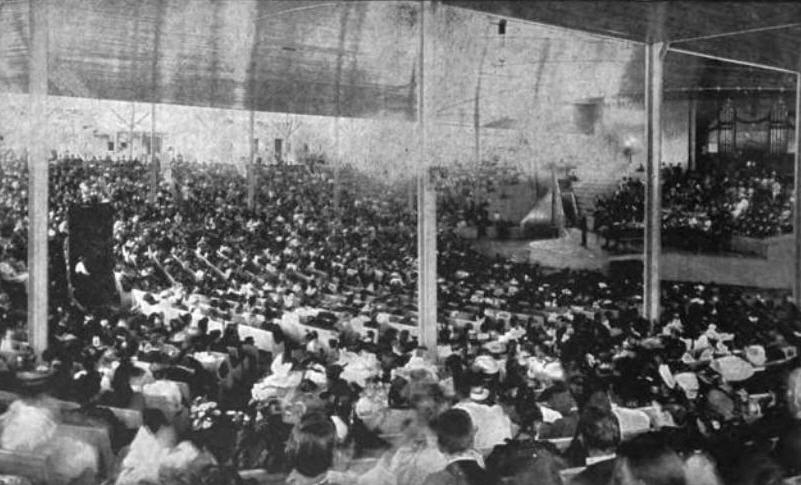 The Auditorium was used for the first four years, then the Amphitheatre—a more permanent, open-air structure—was erected that could hold many more people. The Amphitheatre’s crowning glory was its magnificent pipe organ. The seats behind the Amphitheatre stage were typically occupied by speakers, performers, choirs and orchestras.