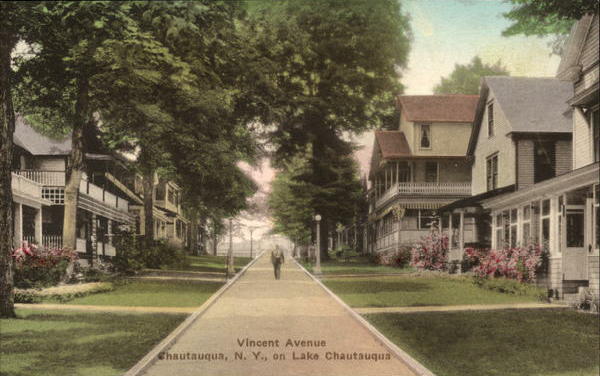 And below is a photo of Vincent Avenue, named for Methodist Bishop John Heyl Vincent, one of the founders of the Chautauqua Institute. The photo was taken in 1930, long after the girls’ first visit.