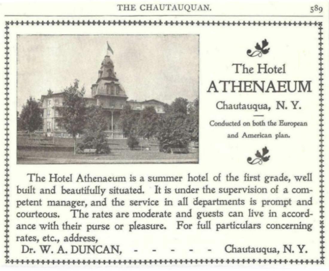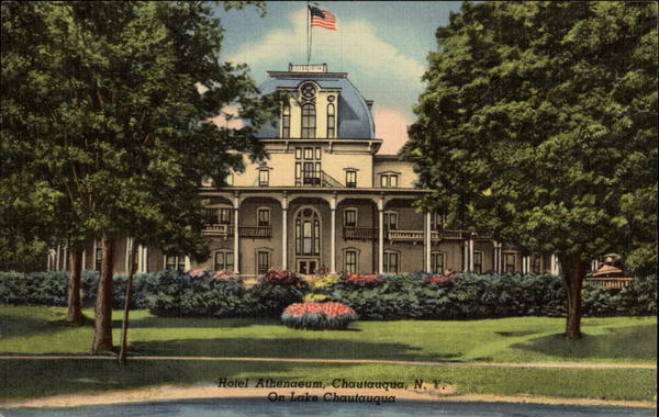 This image of The Hotel Athenaeum and its verandas is dated 1911, just two years before Four Mothers at Chautauqua was published.