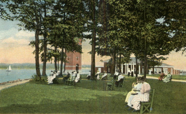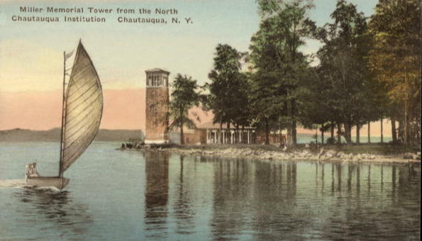 In 1911 the Miller Bell Tower was erected alongside the dock. It was built to commemorate the life and contributions of Chautauqua co-founder Lewis Miller. When the girls returned in 1913 (as described in Isabella Alden’s book, Four Mothers atChautauqua), they would have seen the beautiful new bell tower as they approached the dock; and they would pass it as they stepped off the boat and entered the Institute grounds.