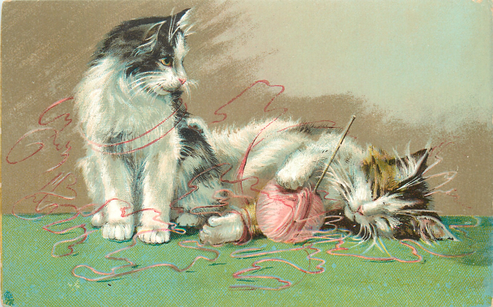 Having learned it (which I am sure you can do in an hour), get two large-size needles of steel, or ivory, or wood (I like to use wood) and a ball of the very coarsest tidy cotton you can find, and set to work. Cast on as many stitches as the needle will conveniently carry, and knit back and forth, back and forth industriously, until you have a strip a yard long. Oh, it will require patience and industry! But I told you that in the beginning, you know.