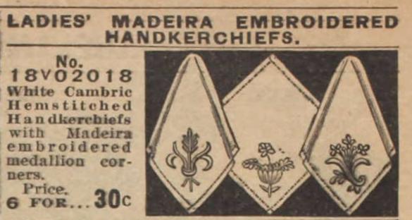 And since a lady could never have enough handkerchiefs, Julia might instead have opted to give Sadie a dozen of them (with fancy colored borders) at a cost of just 48 cents: