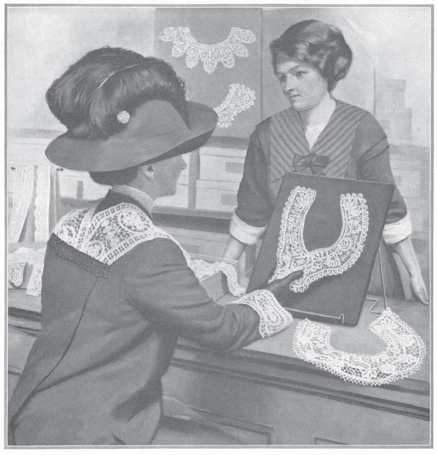 Unlike Mrs. Dunlap, Mrs. Solomon Smith (in Mrs. Solomon Smith Looking On) was something of an expert when it came to lace. She had a keen eye and knew the value of a dollar. But when she attended her niece’s wedding in the big city, she went shopping in a department store for the first time, where she found herself dealing with a less-than-honest sales clerk when she tried to buy “real lace:”