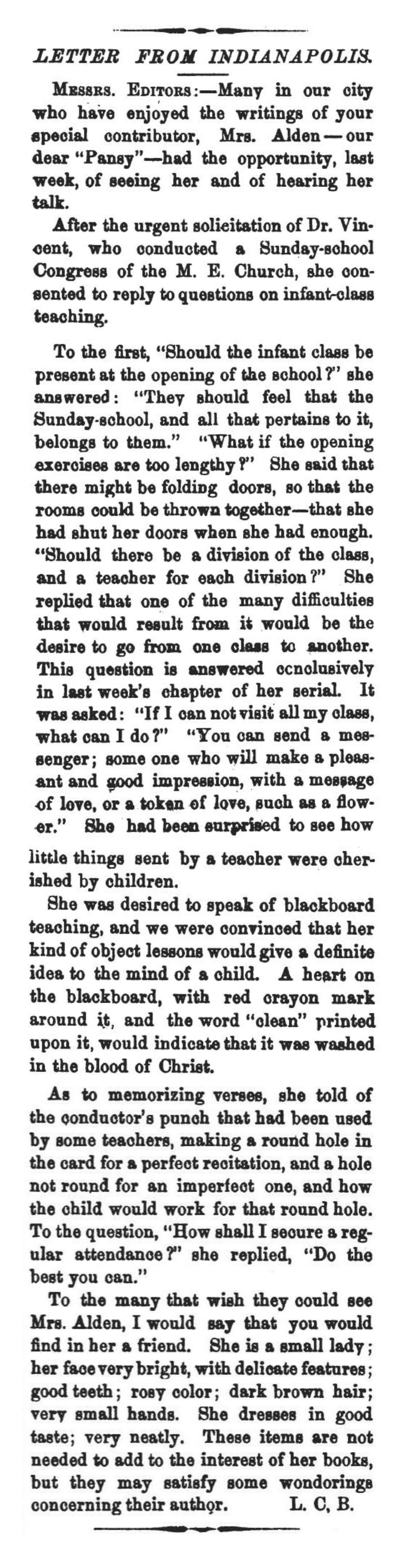 Messrs. Editors: Many in our city who have enjoyed the writings of your special contributor, Mrs. Alden—our dear “Pansy”—had the opportunity, last week, of seeing her and of hearing her talk.