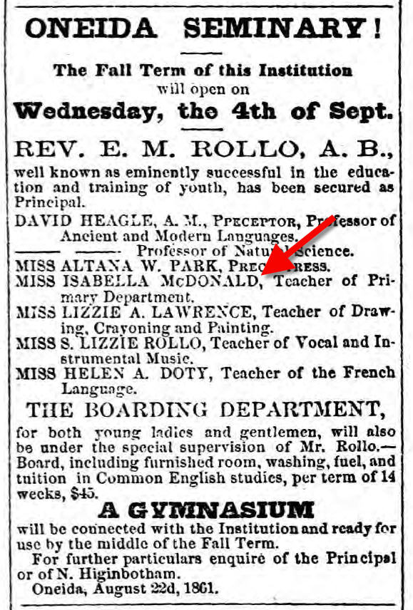 Her older sister Marcia and Marcia’s husband Charles Livingston were also at Oneida Seminary. Marcia and Charles lived in apartments on the campus because Charles was a professor at the school; so Isabella had family close by.