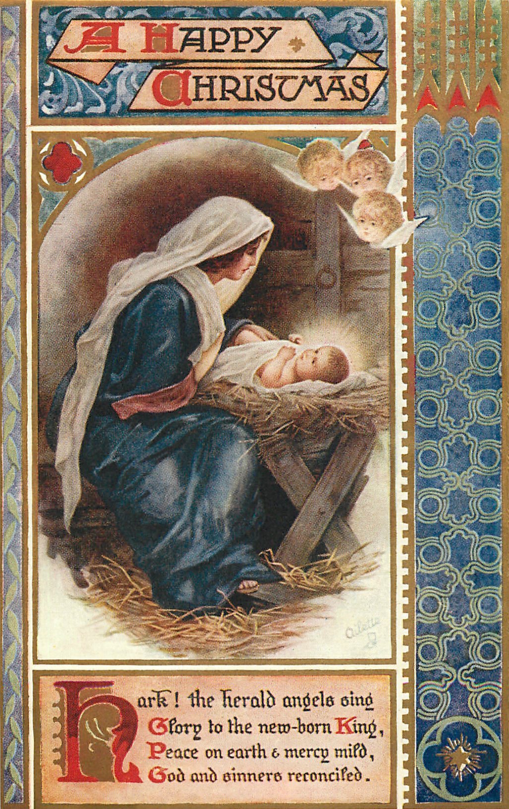 A vintage Christmas card with the title A Happy Christmas. Below is an illustration of the Virgin Mary seated in the manger beside a make-shift crib where the baby Jesus is lying on a bed of straw and looking up at her. Below are the words, "Hark! the herald angels sing, Glory to the new-born King, Peace on earth & mercy mild, God and sinners reconciled."